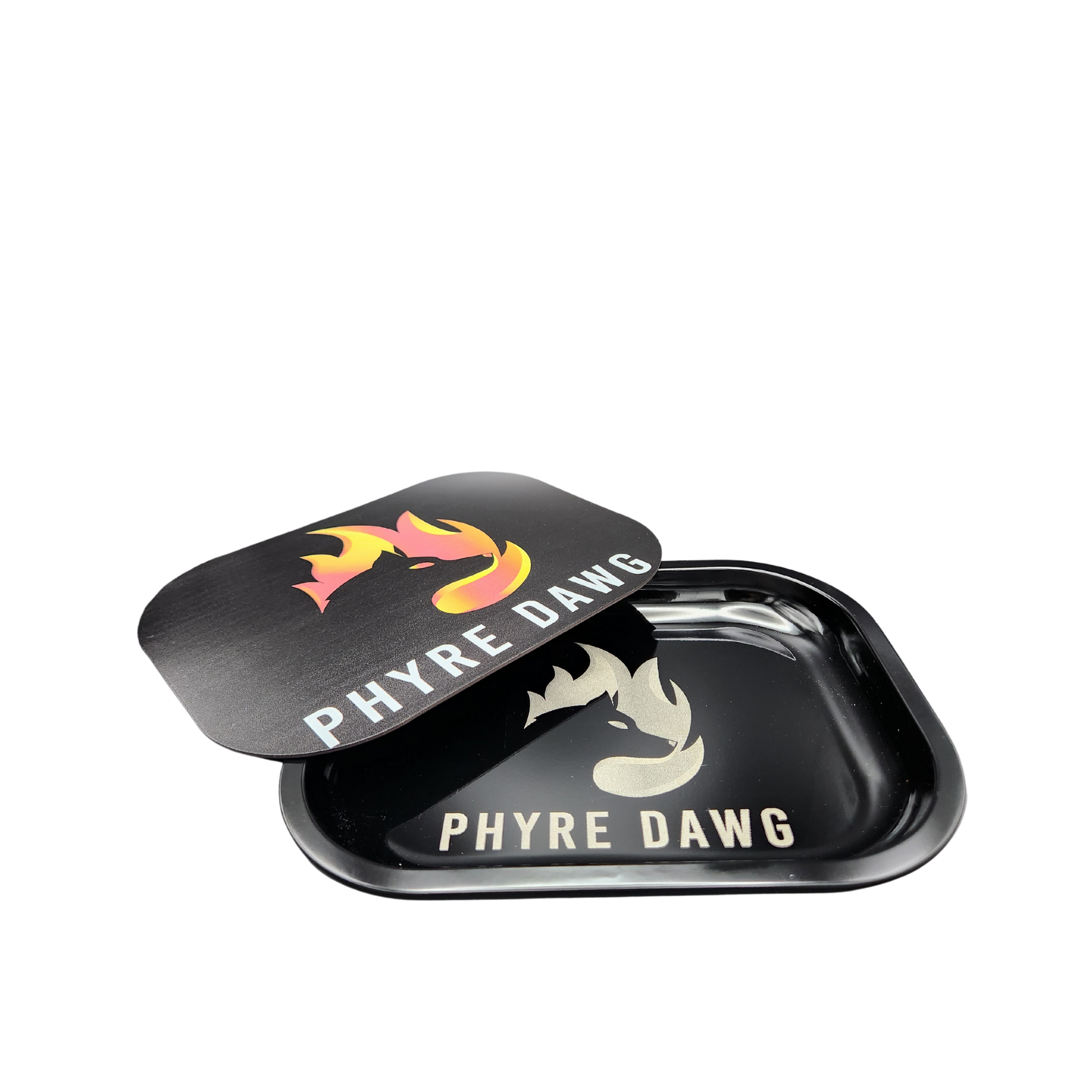 The rolling tray features a vibrant and eye-catching design, showcasing the iconic Phyre Dawg logo engraved onto the tray. The magnetic lid showcases a full colour print logo and keeps you from having messy spills.